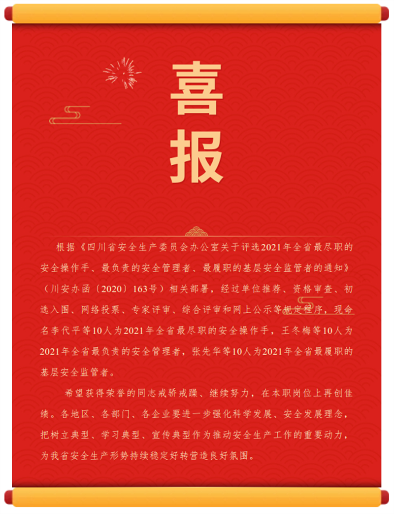 此次评选活动,最终命名“全省最尽职的安全操作手、最负责的安全管理者、最履职的基层安全监管者”各10名。彭联平顺利获得单位自荐、资格审查、初选入围、网络投票、专家评审、综合评审和网上公示层层选拔,最终取得“2021年全省最尽职的安全操作手”称号,是雅安市唯一获此殊荣的个人。
