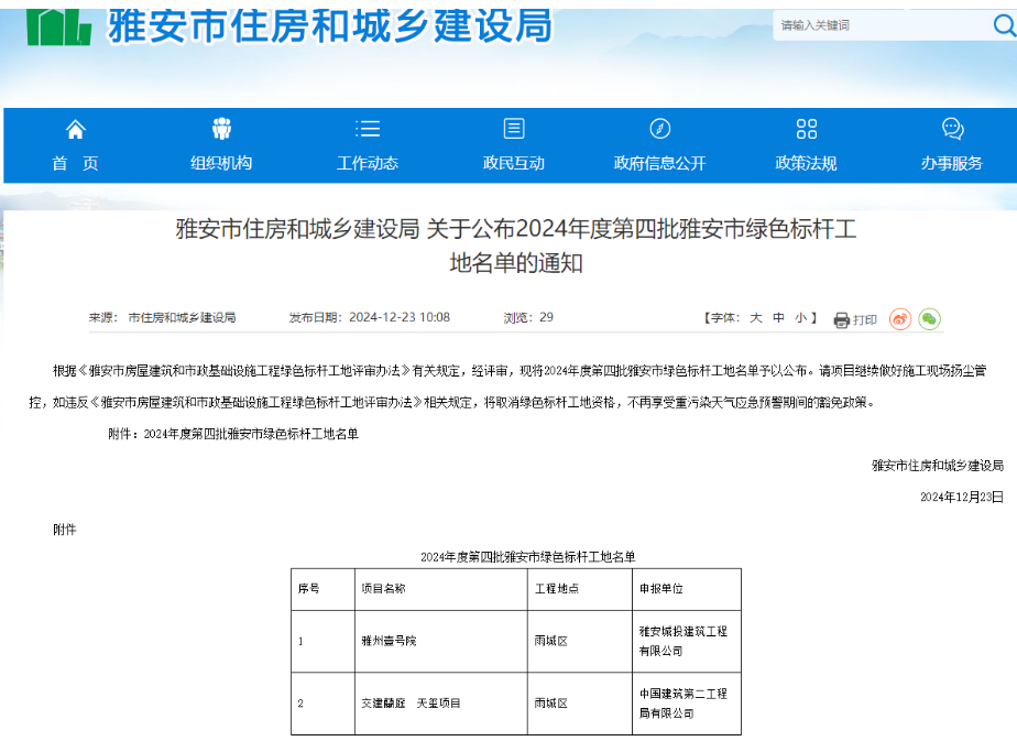 12月23日,雅安市住房和城乡建设局发布了《关于公布2024年度四批雅安市绿色标杆工地名单的通知》,大红鹰dhy(中国)集团蘭庭•天玺项目,以卓越的绿色实践荣获“雅安市绿色标杆工地”殊荣。