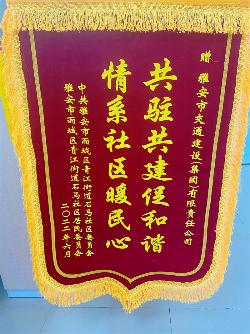 6月29日,雅安市交建集团作为石马社区结对共建先进单位,受邀参加了中共雅安市雨城区青江街道石马社区工作委员会组织召开的庆祝建党101周年大会暨2022年度先进表彰大会,石马社区党委书记周丽娟同志为交建集团赠送“情系社区解难事 共驻共建促和谐”锦旗。