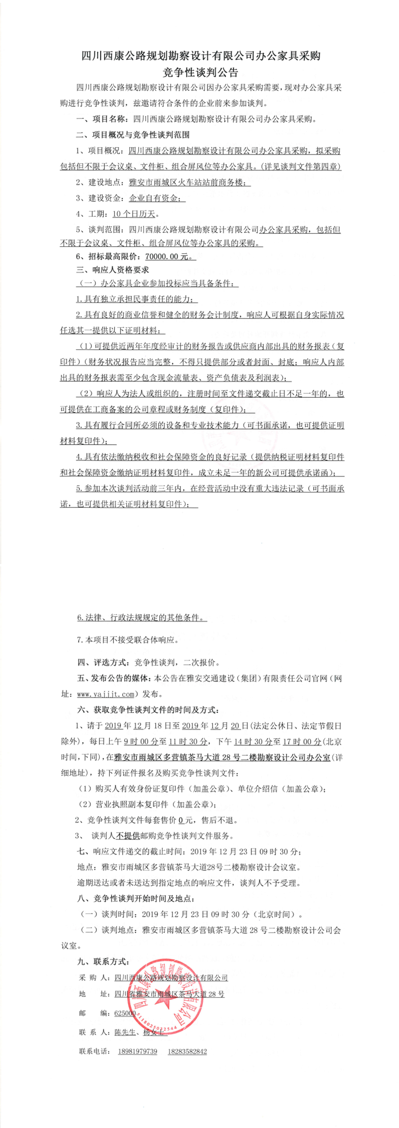 四川西康公路规划勘察设计有限公司办公家具采购竞争性谈判公告