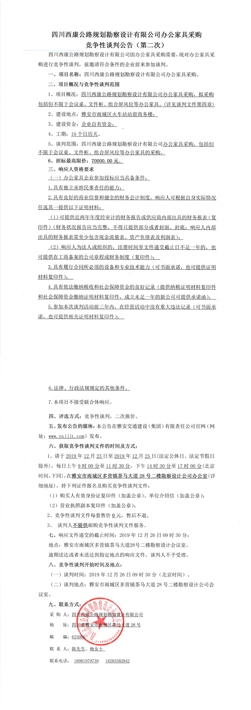 四川西康公路规划勘察设计有限公司办公家具采购竞争性谈判公告(第二次)