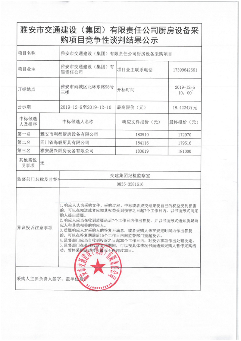 雅安市交通建设(集团)有限责任公司厨房设备采购项目竞争性谈判结果公示