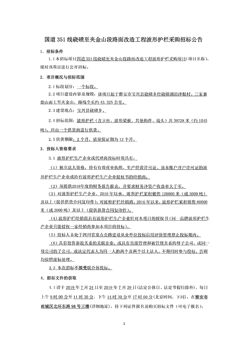 大红鹰dhy(中国)集团路桥有限责任公司国道351线硗碛至夹金山段路面改造工程波形护栏采购招标公告
