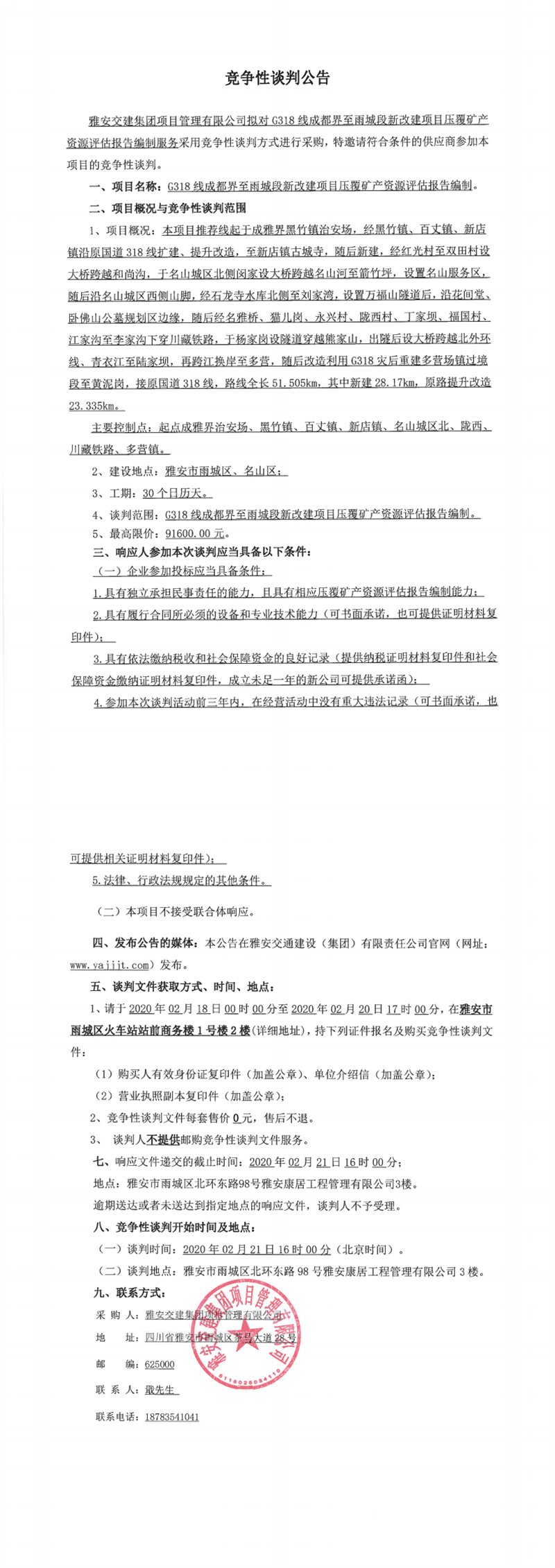 大红鹰dhy(中国)集团项目管理有限公司G318线成都界至雨城段新改建项目压覆矿产资源评估报告编制竞争性谈判公告