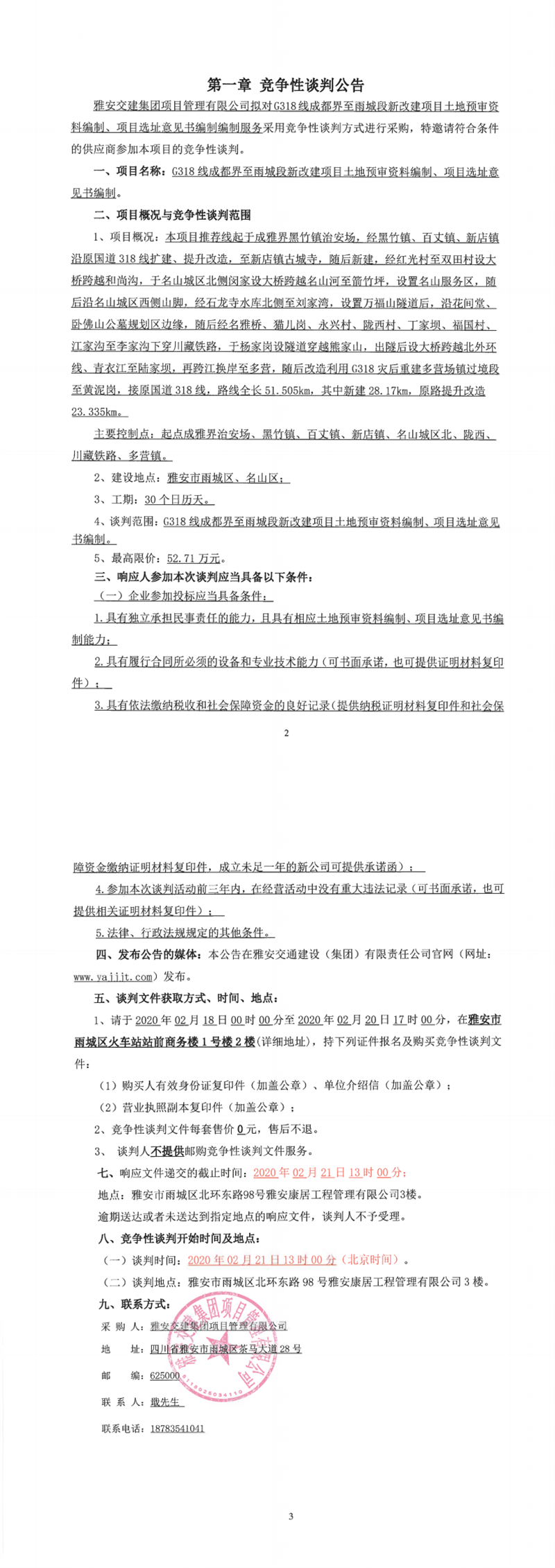 大红鹰dhy(中国)集团项目管理有限公司G318线成都界至雨城段新改建项目土地预审资料编制、项目选址意见书编制竞争性谈判公告