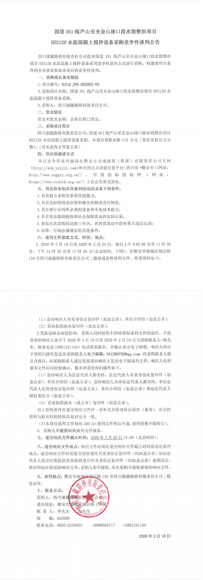 四川康藏路桥有限责任公司国道351线芦山至夹金山垭口段水毁整治项目 HZS120水泥混凝土搅拌设备采购竞争性谈判公告