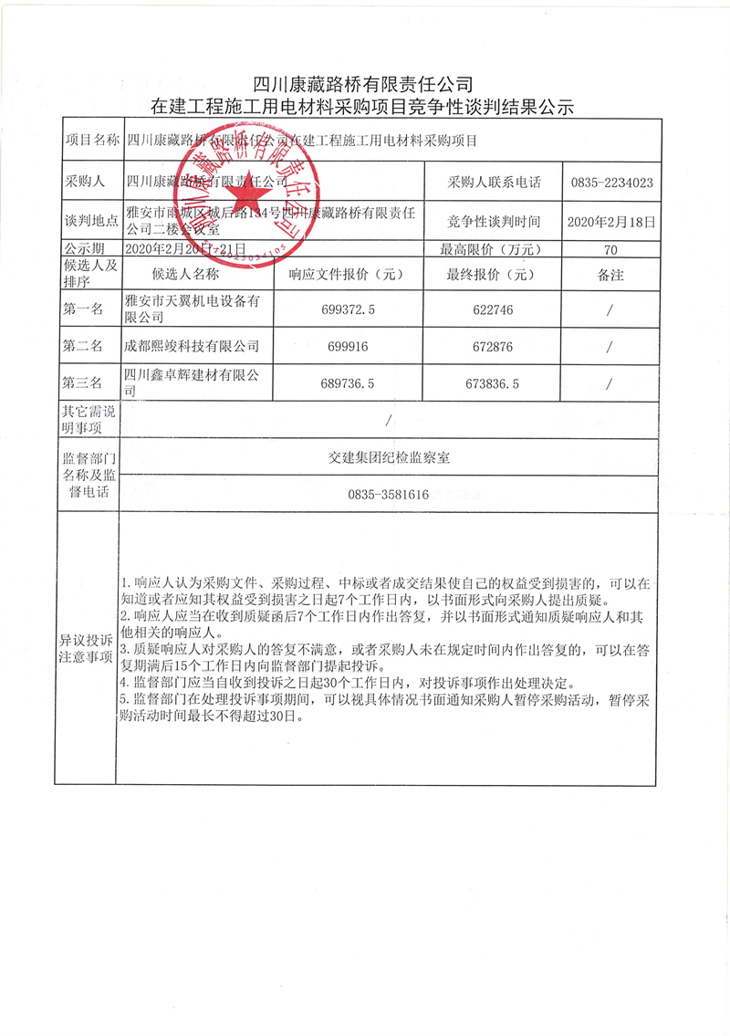 四川康藏路桥有限责任公司在建工程施工用电材料采购项目竞争性谈判结果公示