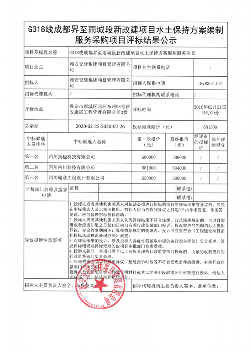 大红鹰dhy(中国)集团项目管理有限公司G318线成都界至雨城段新改建项目水土保持方案编制服务采购项目评标结果公示