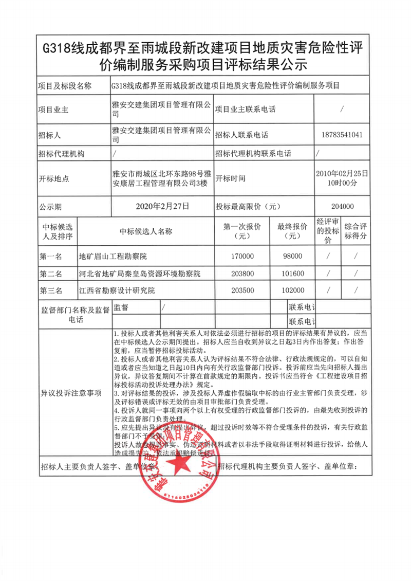 大红鹰dhy(中国)集团项目管理有限公司G318线成都界至雨城段新改建项目地质灾害危险性评价编制服务项目评标结果公示