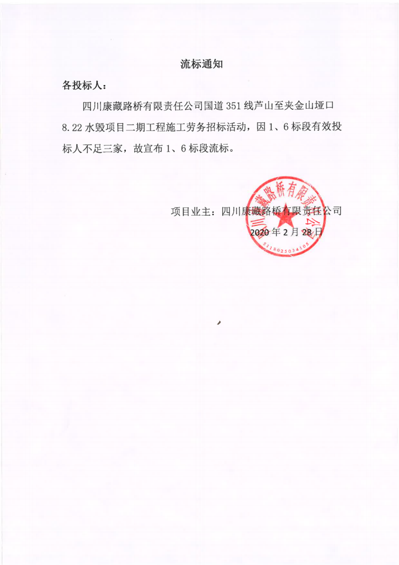 四川康藏路桥有限责任公司国道351线芦山至夹金山垭口8.22水毁项目二期工程施工劳务(1标段、6标段)流标通知