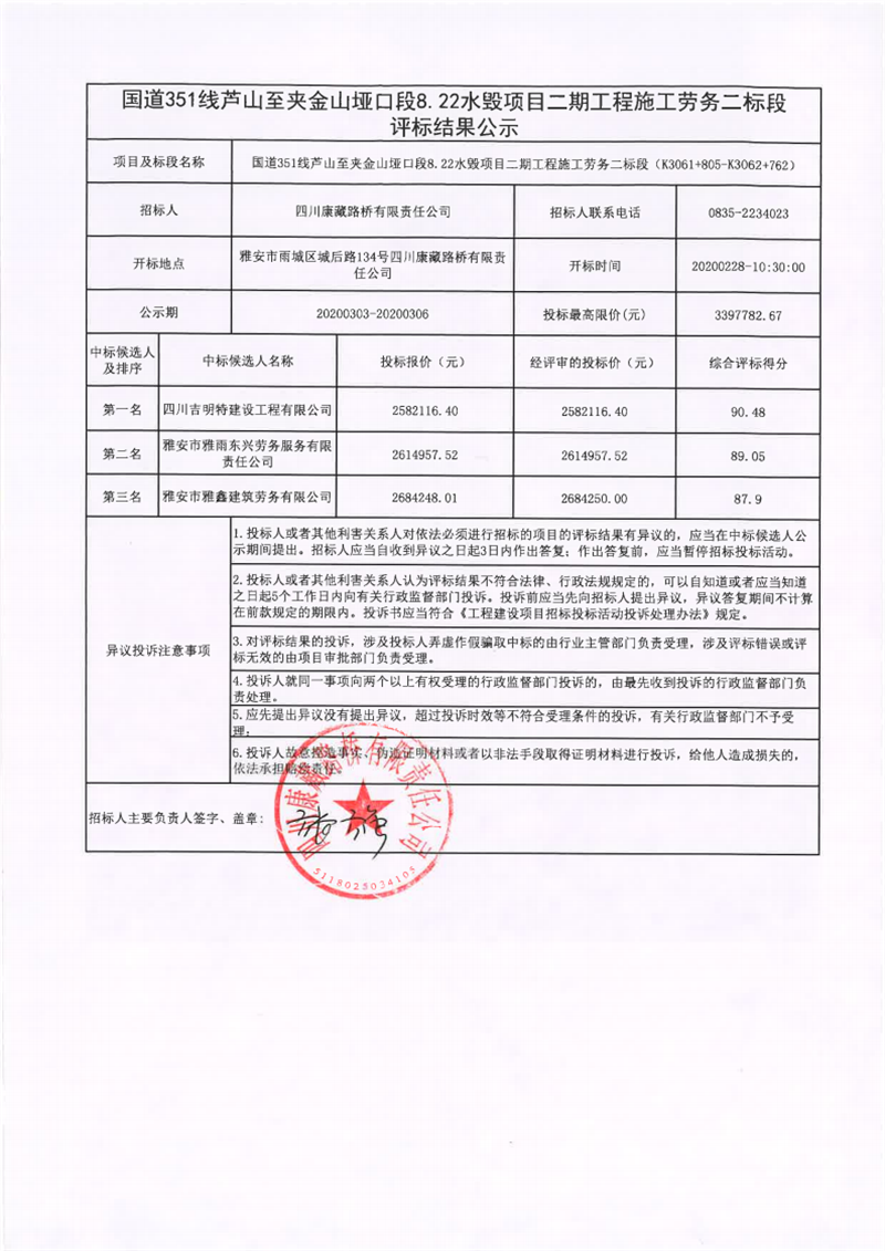 四川康藏路桥有限责任公司国道351线芦山至夹金山垭口段8.22水毁项目二期工程施工劳务二标段评标结果公示