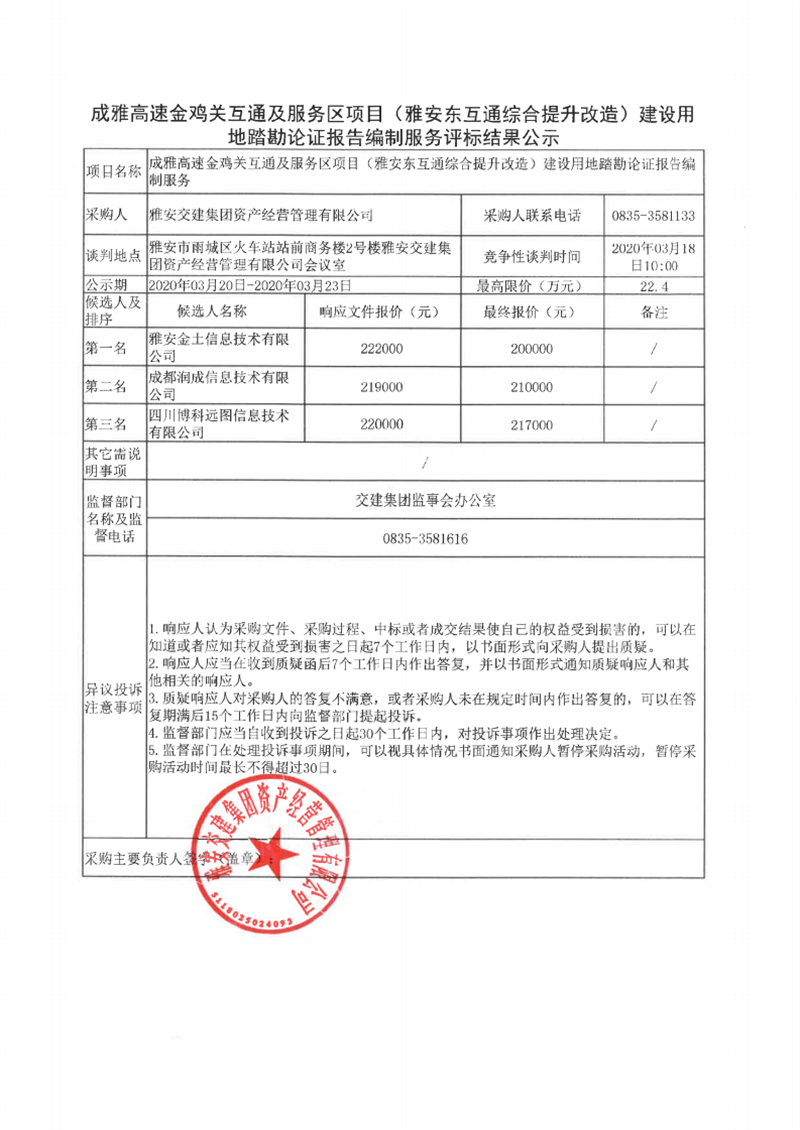 大红鹰dhy(中国)集团资产经营管理有限公司成雅高速金鸡关互通及服务区项目(雅安东互通综合提升改造)建设用地踏勘论证报告编制服务评标结果公示