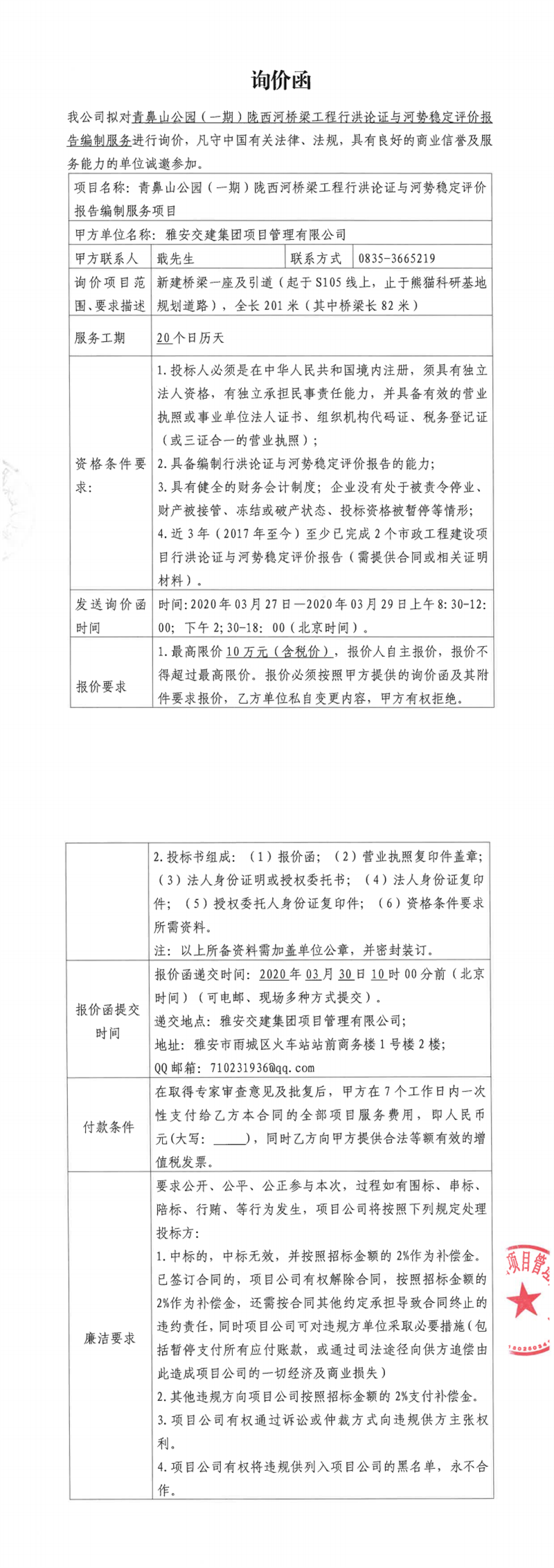大红鹰dhy(中国)集团项目管理有限公司青鼻山公园(一期)陇西河桥梁工程行洪论证及河势稳定评价报告编制服务项目询价函