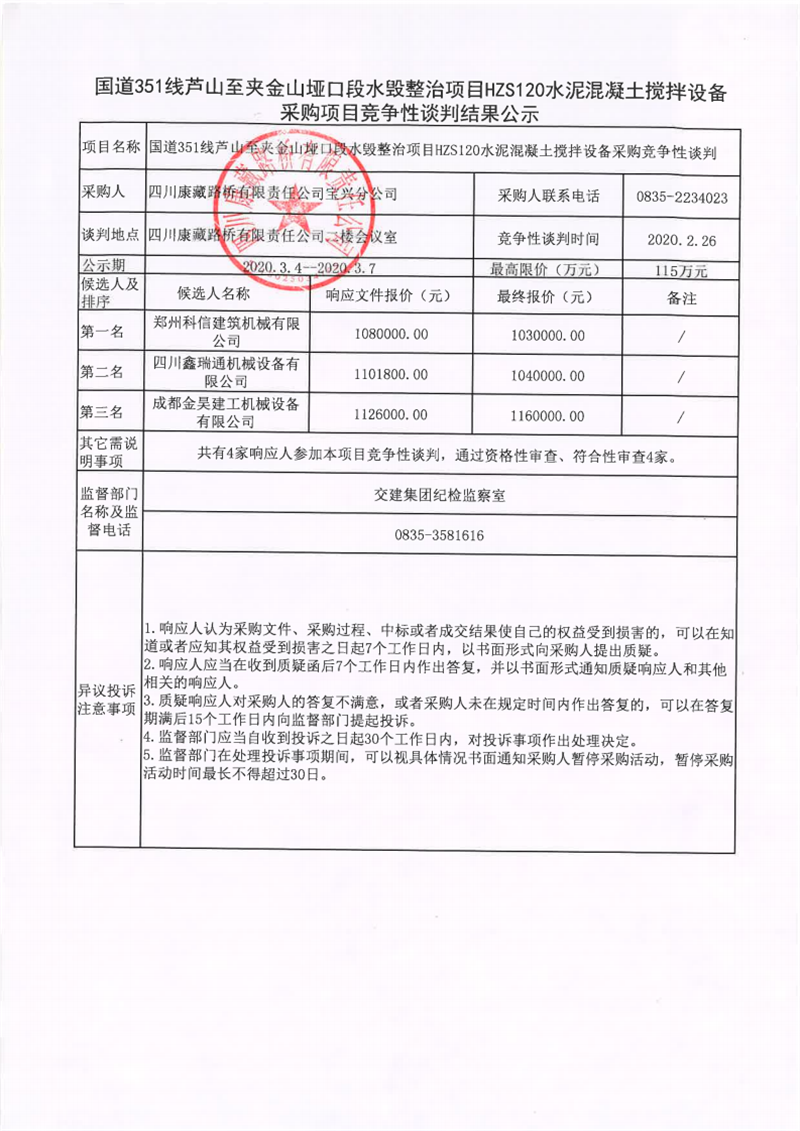 四川康藏路桥有限责任公司国道351线芦山至夹金山垭口段水毁整治项目在建工程项目HZS120水泥混凝土搅拌设备采购项目竞争性谈判结果公示