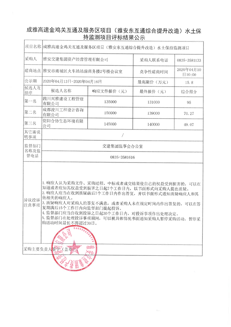 大红鹰dhy(中国)集团资产经营管理有限公司成雅高速金鸡关互通及服务区项目(雅安东互通综合提升改造)水土保持监测项目评标结果公示