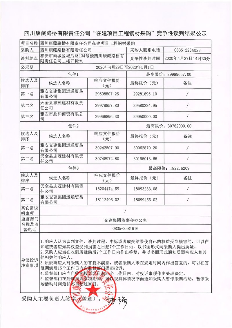四川康藏路桥有限责任公司“在建项目工程钢材采购”竞争性谈判结果公示