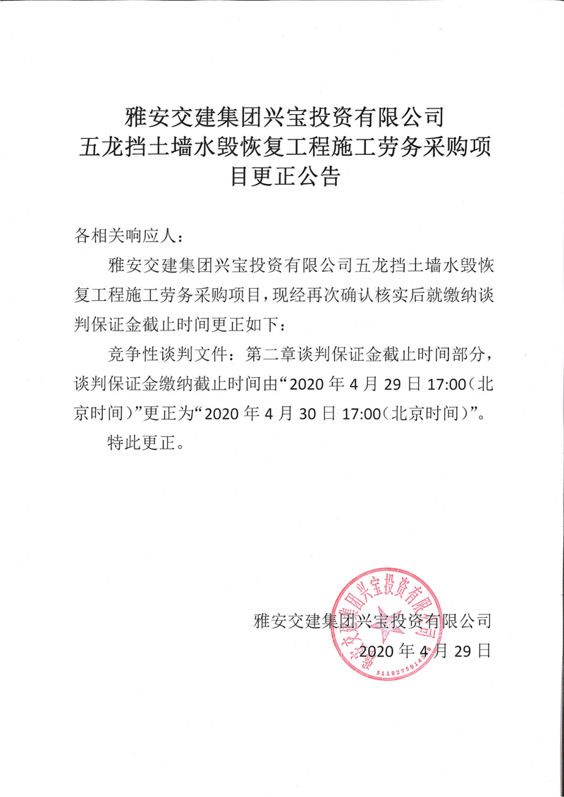 大红鹰dhy(中国)集团兴宝投资有限公司五龙挡土墙水毁恢复工程施工劳务采购项目更正公告
