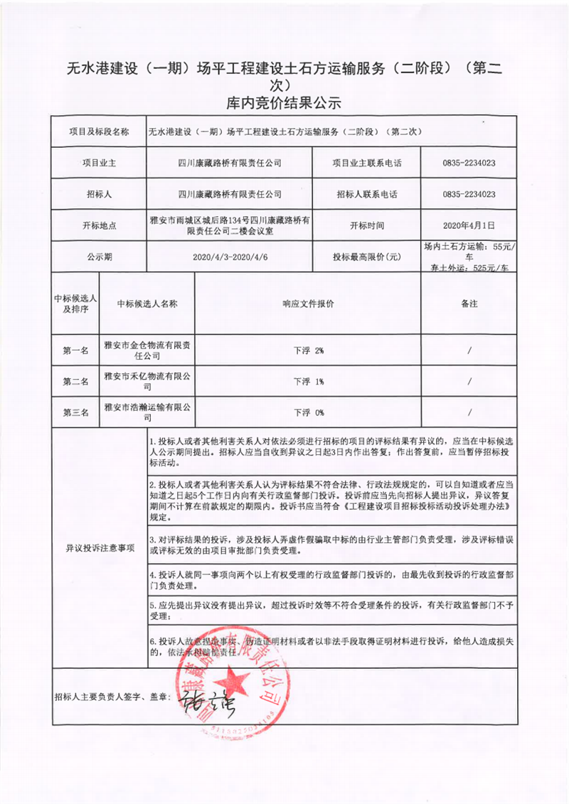 四川康藏路桥有限责任公司无水港建设(一期)场平工程土石方运输服务(二阶段)(第二次)库内竞价结果公示