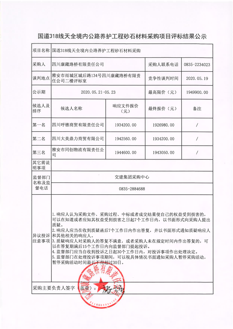 四川康藏路桥有限责任公司国道318线天全境内公路养护工程砂石材料采购项目评标结果公示