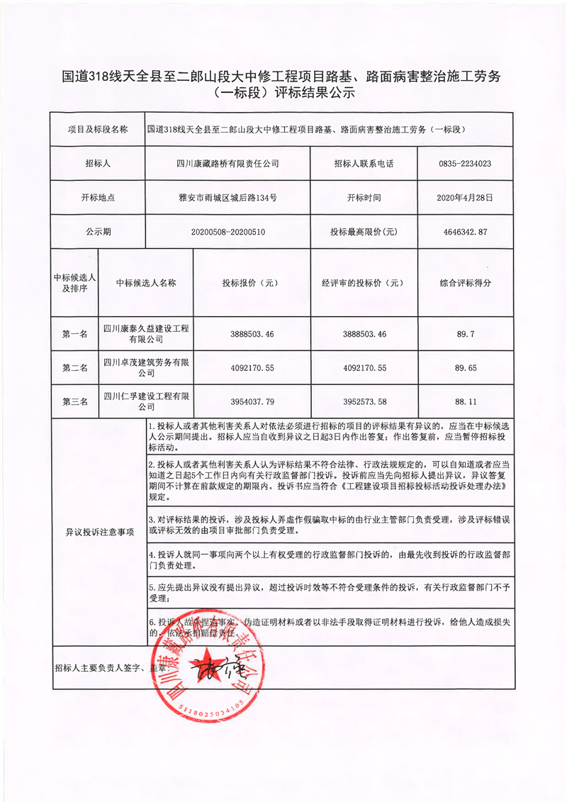 四川康藏路桥有限责任公司国道318线天全县至二郎山段大中修工程项目路基、路面病害整治施工劳务(一标段)评标结果公示