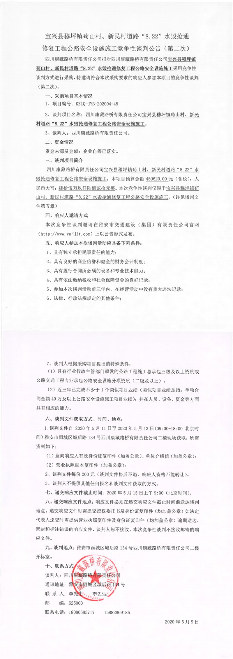 四川康藏路桥有限责任公司宝兴县穆坪镇苟山村、新民村道路“8.22”水毁抢通修复工程公路安全设施施工竞争性谈判公告(第二次)