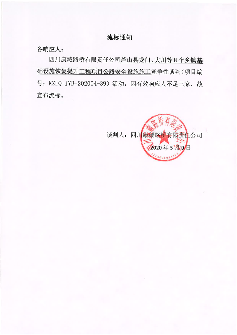 四川康藏路桥有限责任公司芦山县龙门、大川等8个乡镇基础设施恢复提升工程项目公路安全设施施工竞争性谈判流标通知