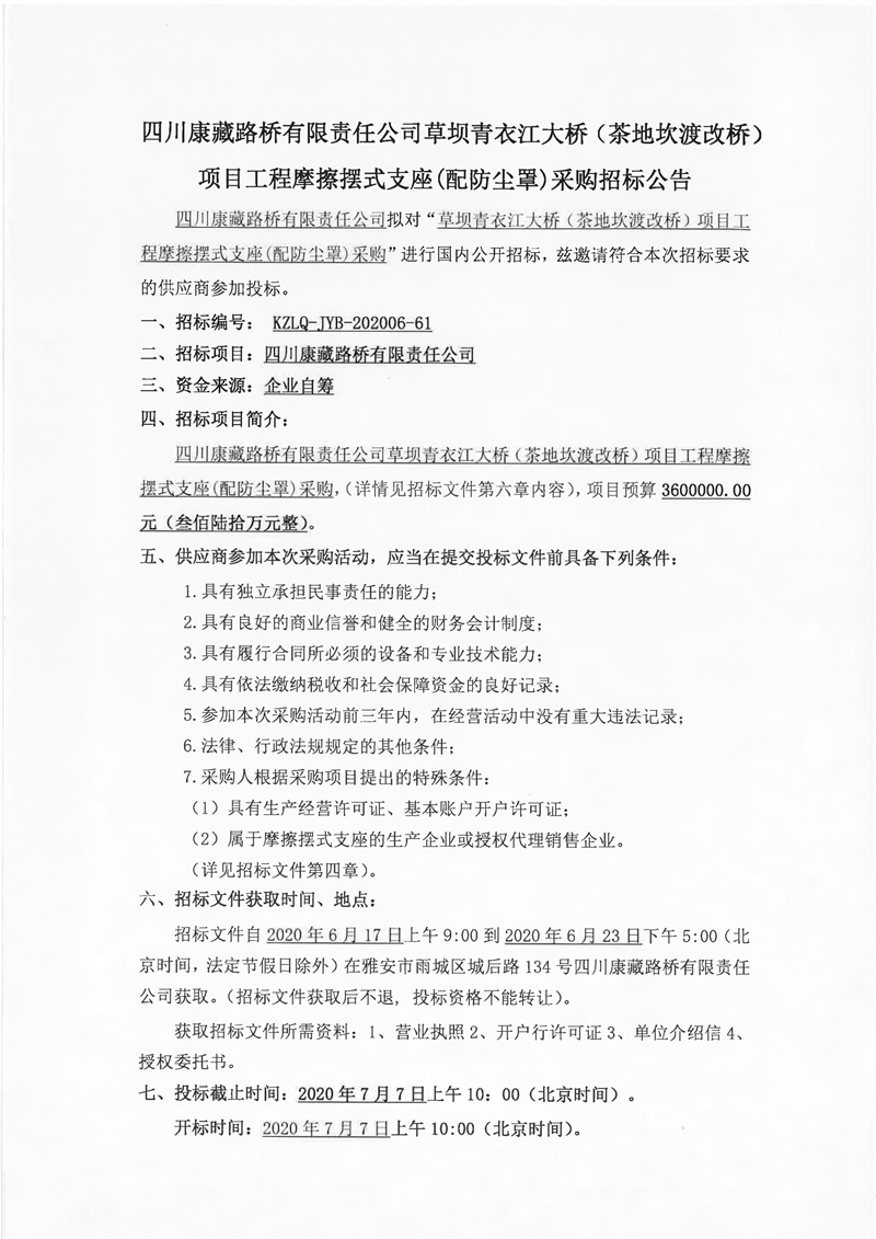 四川康藏路桥有限责任公司草坝青衣江大桥(茶地坎渡改桥)项目工程摩擦摆式支座(配防尘罩)采购招标公告