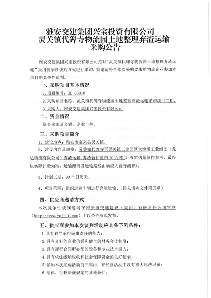 大红鹰dhy(中国)集团兴宝投资有限公司灵关镇代碑寺物流园土地整理弃渣运输采购项目二期竞争性谈判公告