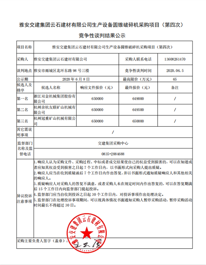 大红鹰dhy(中国)集团云石建材有限公司生产设备圆锥破碎机采购项目(第四次)竞争性谈判结果公示
