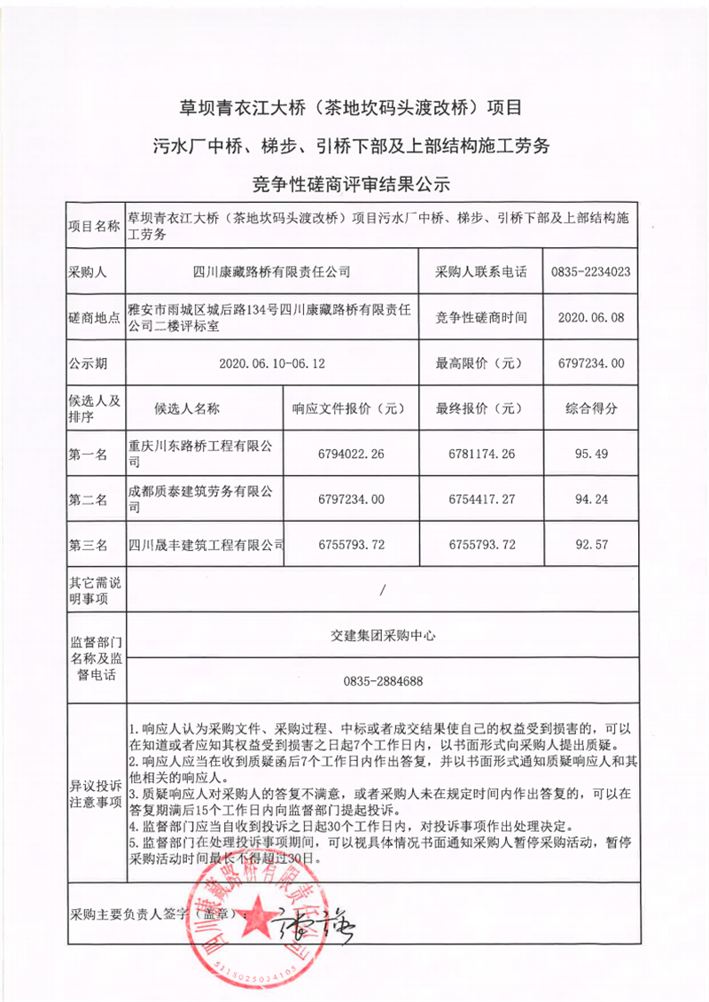 四川康藏路桥有限责任公司草坝青衣江大桥(茶地坎码头渡改桥)项目污水厂中桥、梯步、引桥下部及上部结构施工劳务竞争性磋商评审结果公示
