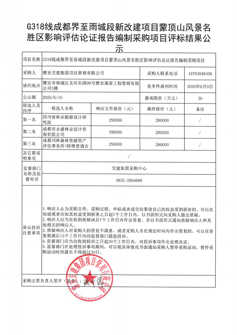 大红鹰dhy(中国)集团项目管理有限公司G318线成都界至雨城段新改建项目蒙顶山风景名胜区影响评估论证报告编制采购项目评标结果公示