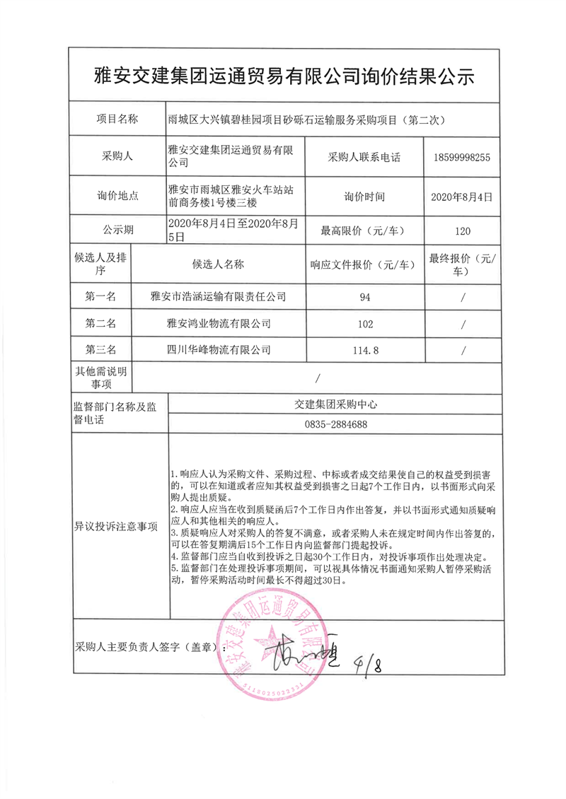 大红鹰dhy(中国)集团运通贸易有限公司雨城区大兴镇碧桂园项目砂砾石运输服务采购项目(第二次)询价结果公示