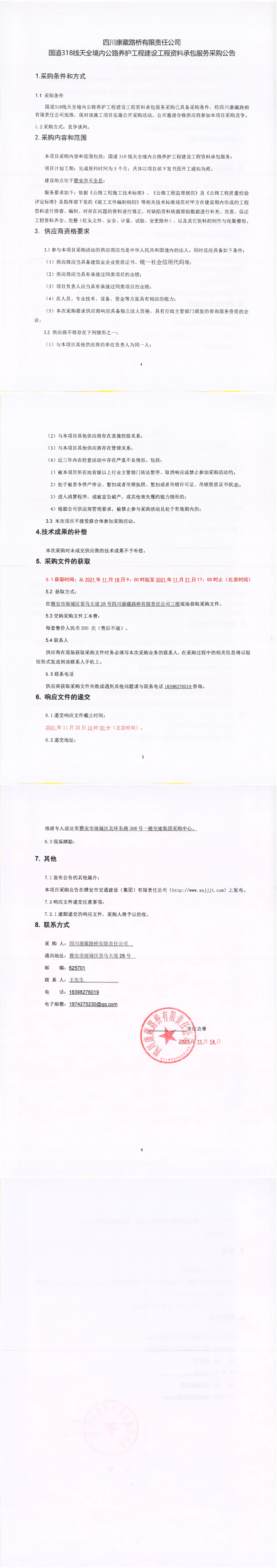 四川康藏路桥有限责任公司国道318线天全境内公路养护工程建设工程资料承包服务采购公告