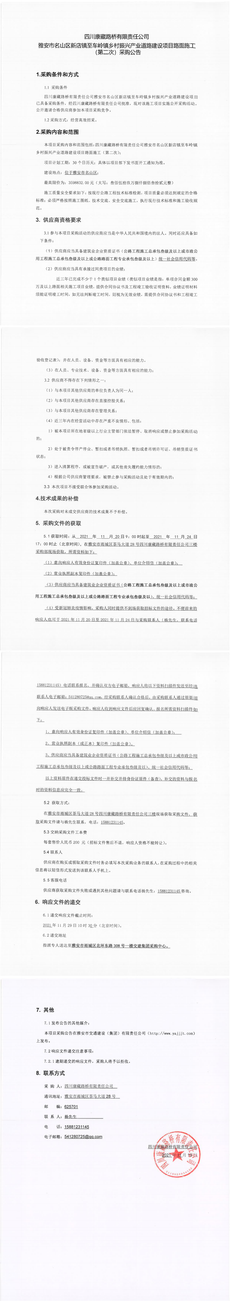 四川康藏路桥有限责任公司雅安市名山区新店镇至车岭镇乡村振兴产业道路建设项目路面施工(第二次)采购公告