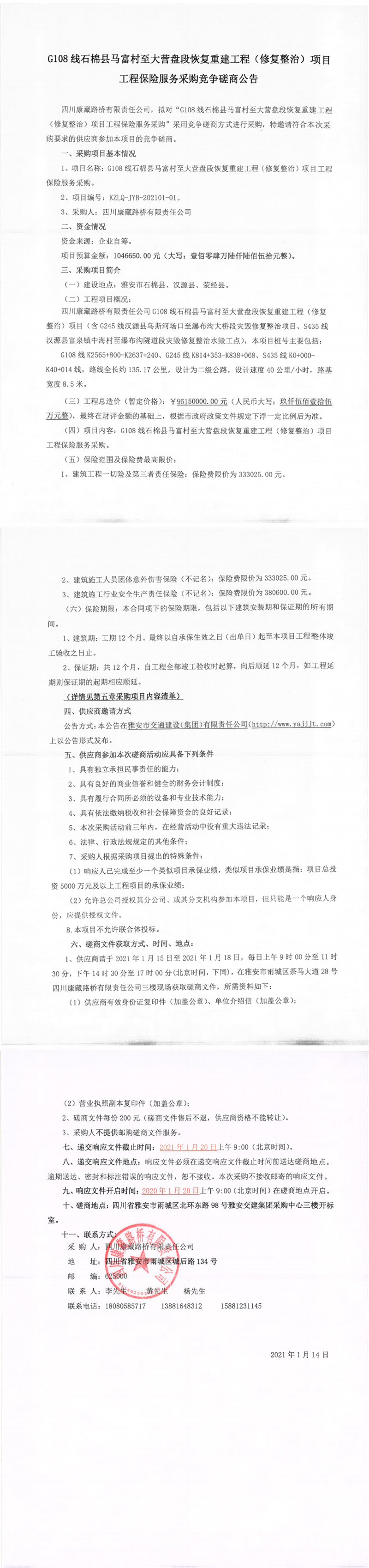 四川康藏路桥有限公司G108线石棉县马富村至大营盘段恢复重建工程(修复整治)项目工程保险服务采购竞争磋商公告