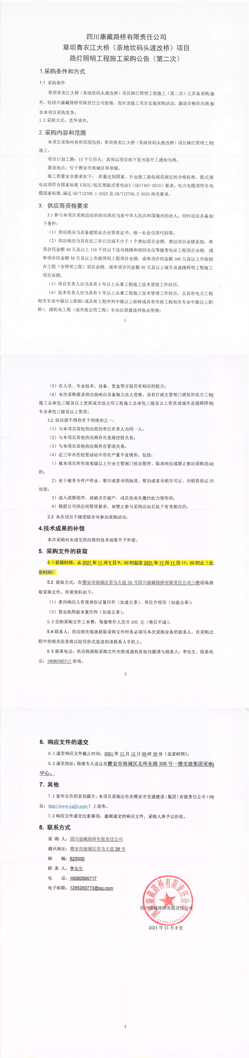 四川康藏路桥有限责任公司草坝青衣江大桥(茶地坎码头渡改桥)项目路灯照明工程施工采购公告(第二次)