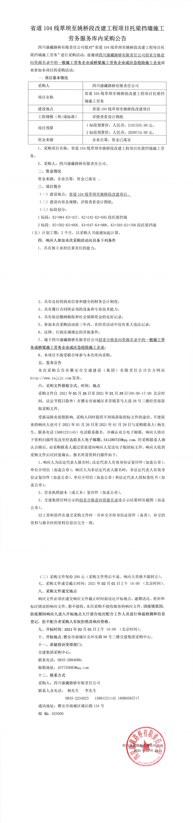 四川康藏路桥有限责任公司省道104线草坝至姚桥段改建工程项目托梁挡墙施工劳务服务库内采购公告