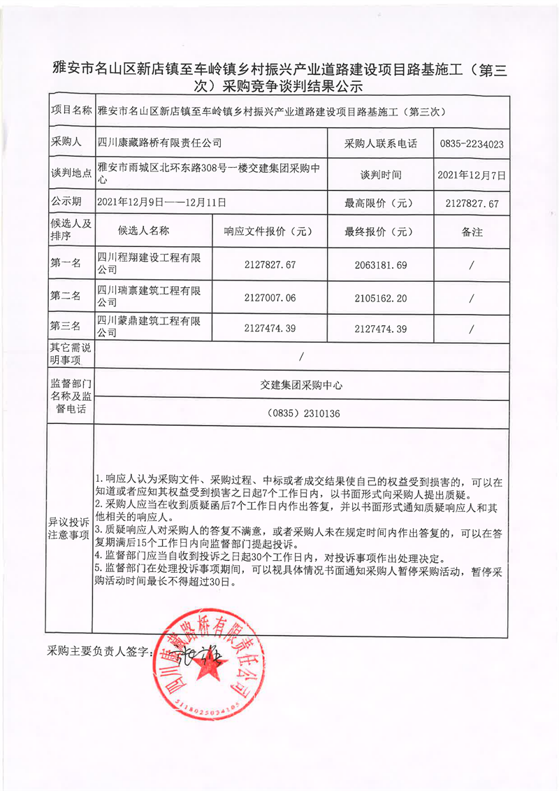 四川康藏路桥有限责任公司雅安市名山区新店镇至车岭镇乡村振兴产业道路建设项目路面施工(第三次)采购竞争谈判结果公示
