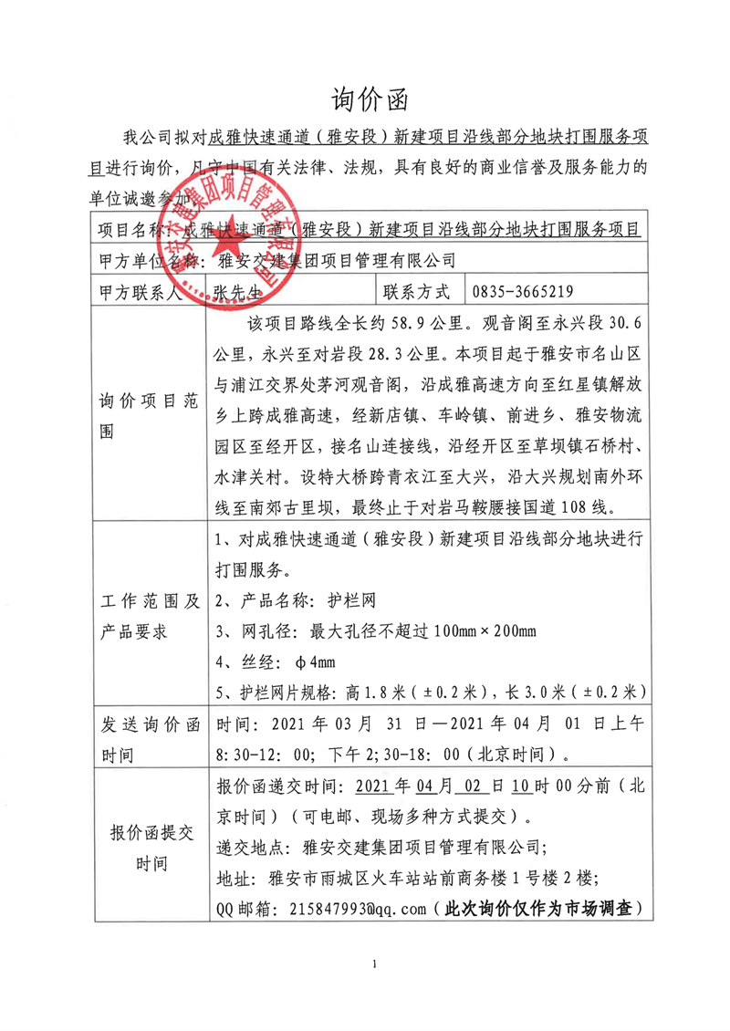 大红鹰dhy(中国)集团项目管理有限公司成雅快速通道(雅安段)新建项目沿线部分地块打围服务项目询价函