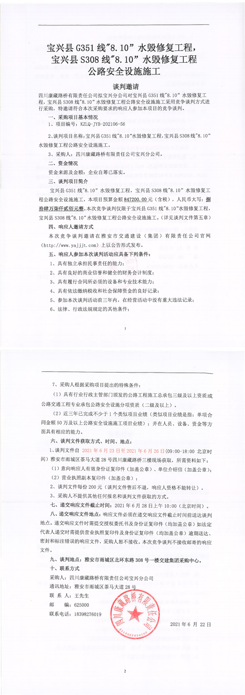 宝兴县G351线“8.10”水毁修复工程,宝兴县S308线“8.10”水毁修复工程公路安全设施施工竞争谈判公告