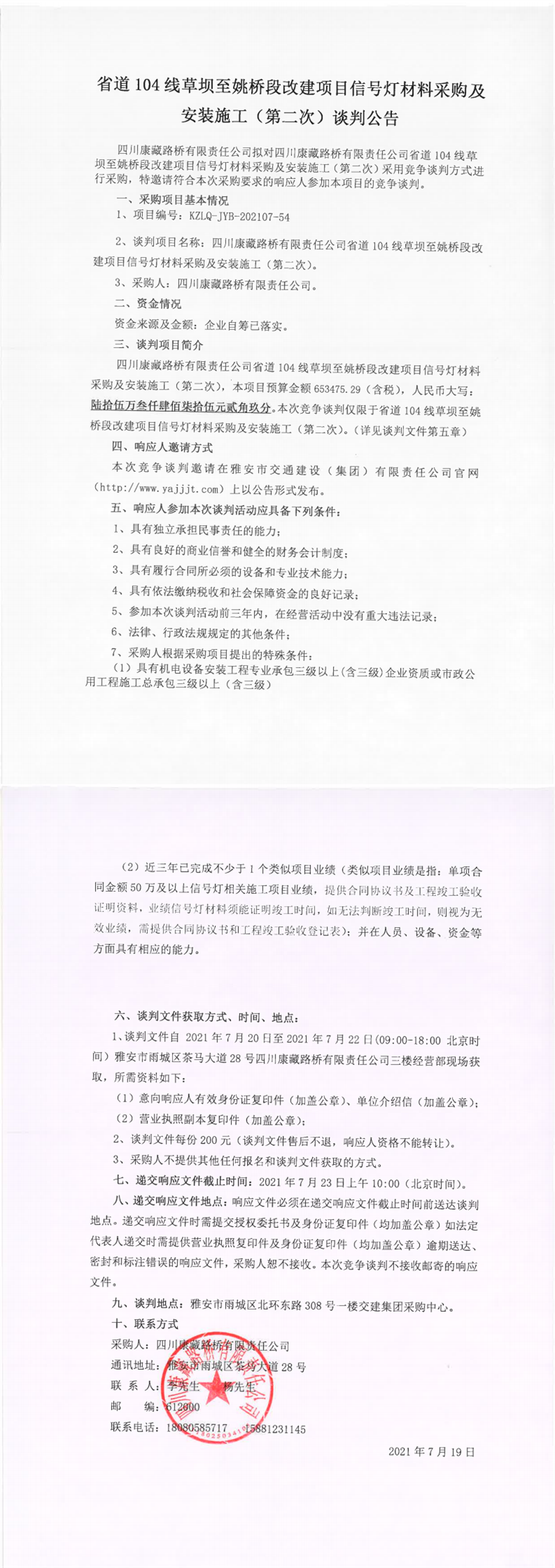 四川康藏路桥有限责任公司省道104线草坝至姚桥段改建项目信号灯材料采购及安装施工(第二次)谈判公告
