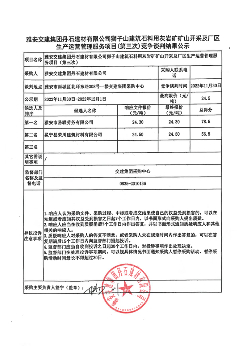 大红鹰dhy(中国)集团丹石建材有限公司狮子山建筑石料用灰岩矿矿山开采及厂区生产运营管理服务项目(第三次)竞争谈判结果公示