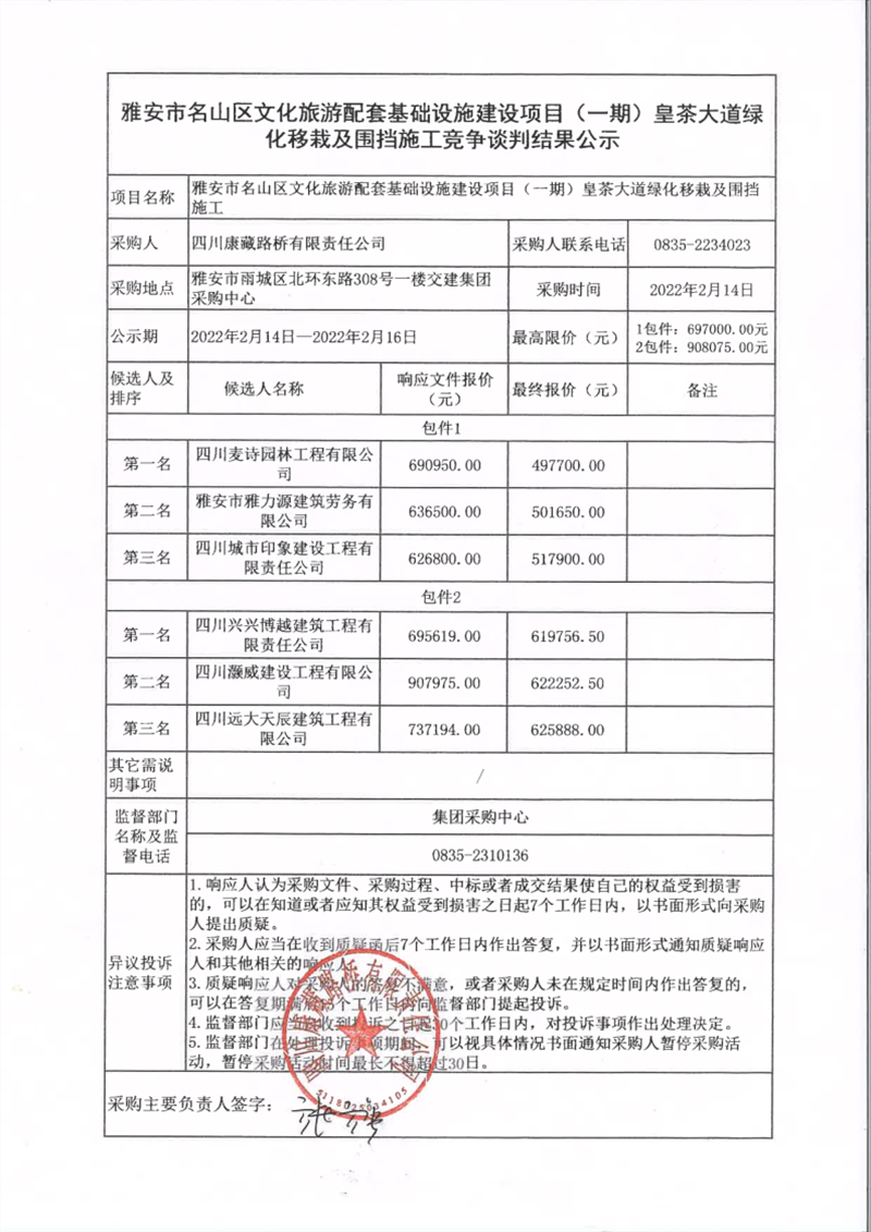 四川康藏路桥有限责任公司雅安市名山区文化旅游配套基础设施建设项目(一期)皇茶大道绿化移栽及围挡施工竞争谈判结果公示