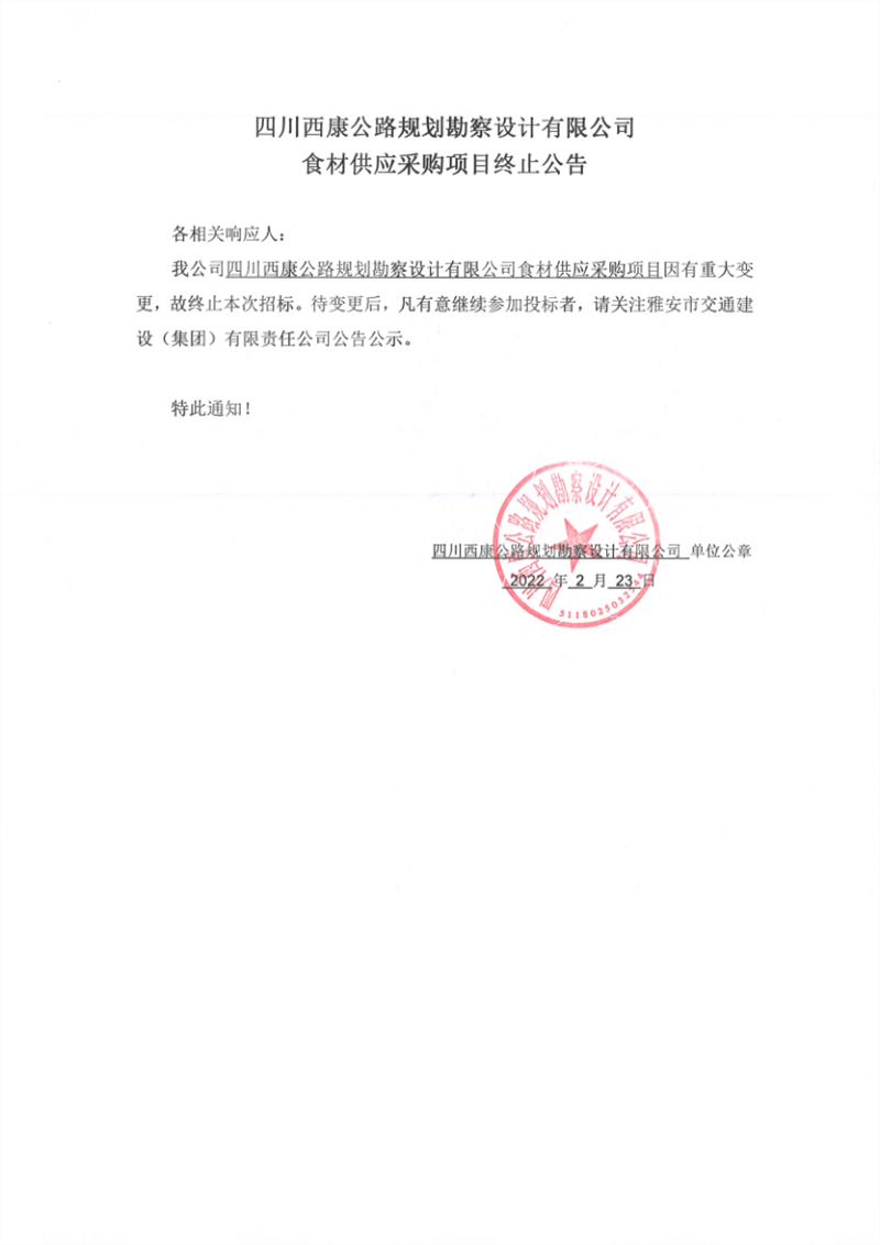 四川西康公路规划勘察设计有限公司食材供应采购项目终止公告