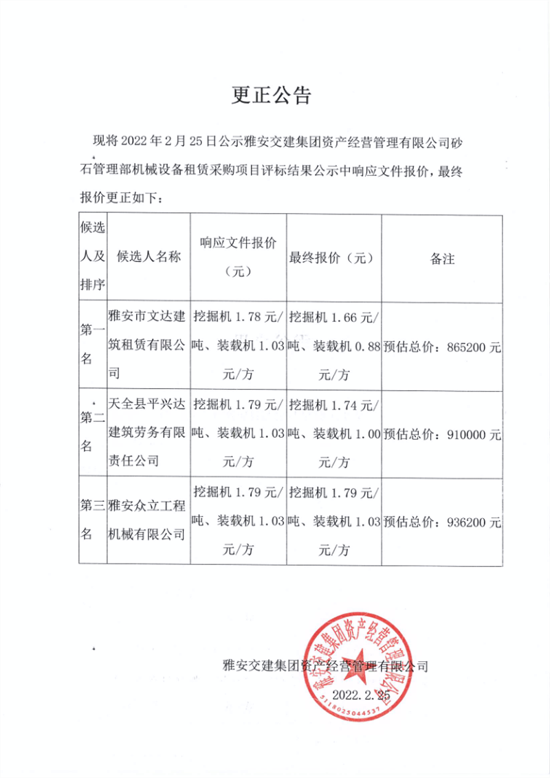 大红鹰dhy(中国)集团资产经营管理有限公司砂石管理部机械设备租赁采购项目评标结果公示更正公告