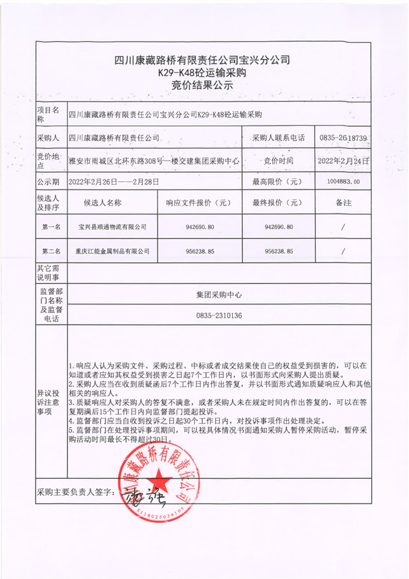 四川康藏路桥有限责任公司宝兴分公司K29-K48砼运输采购竞价结果公示