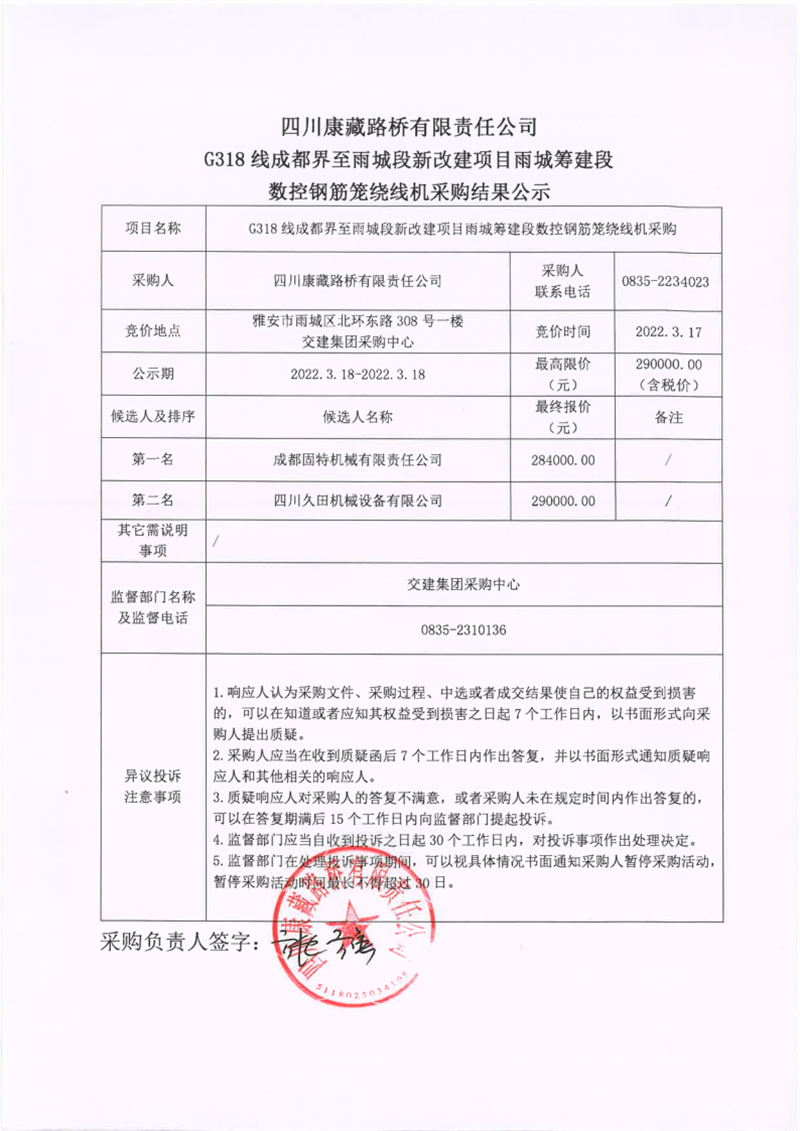 四川康藏路桥有限责任公司G318线成都界至雨城段新改建项目雨城筹建段数控钢筋笼绕线机采购结果公示