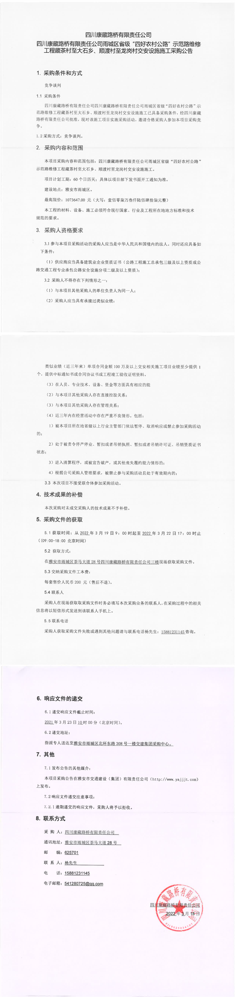 四川康藏路桥有限责任公司雨城区省级“四好农村公路”示范路维修工程藏茶村至大石乡、顺渡村至龙岗村交安设施施工采购公告