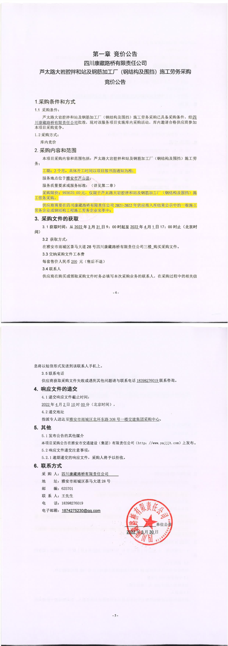 四川康藏路桥有限责任公司芦太路大岩腔拌和站及钢筋加工厂(钢结构及围档)施工劳务采购竞价公告