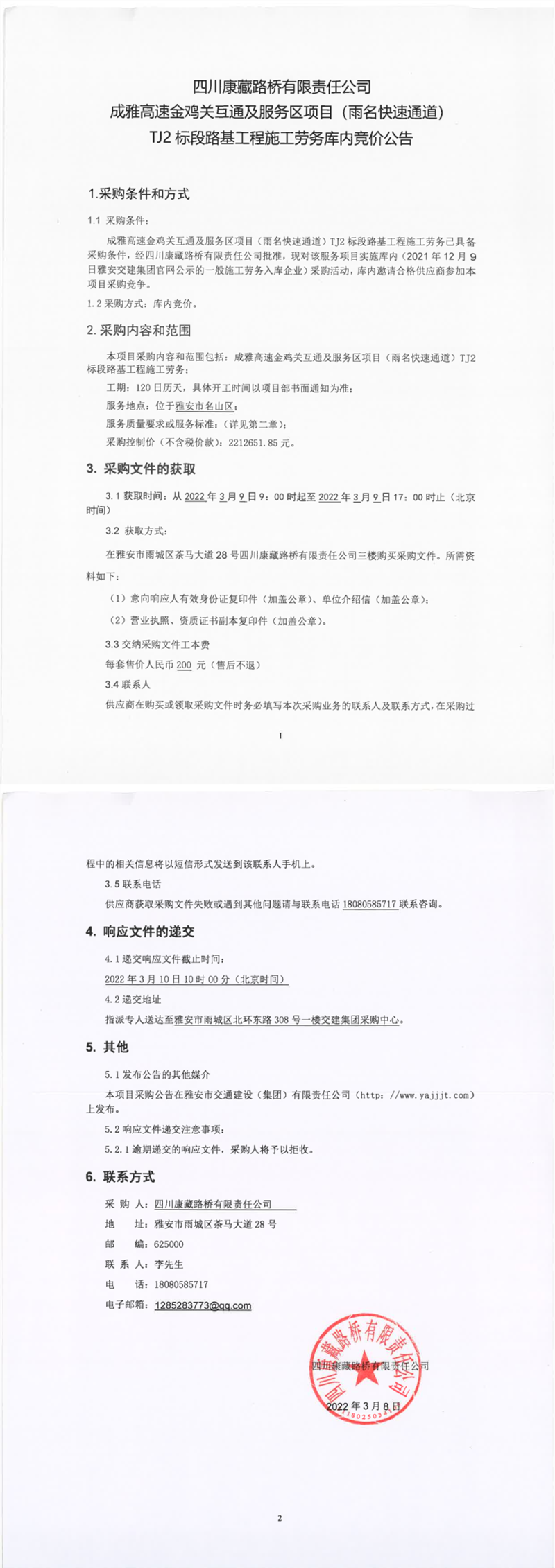 四川康藏路桥有限责任公司成雅高速金鸡关互通及服务区项目(雨名快速通道)TJ2标段路基工程施工劳务库内竞价公告